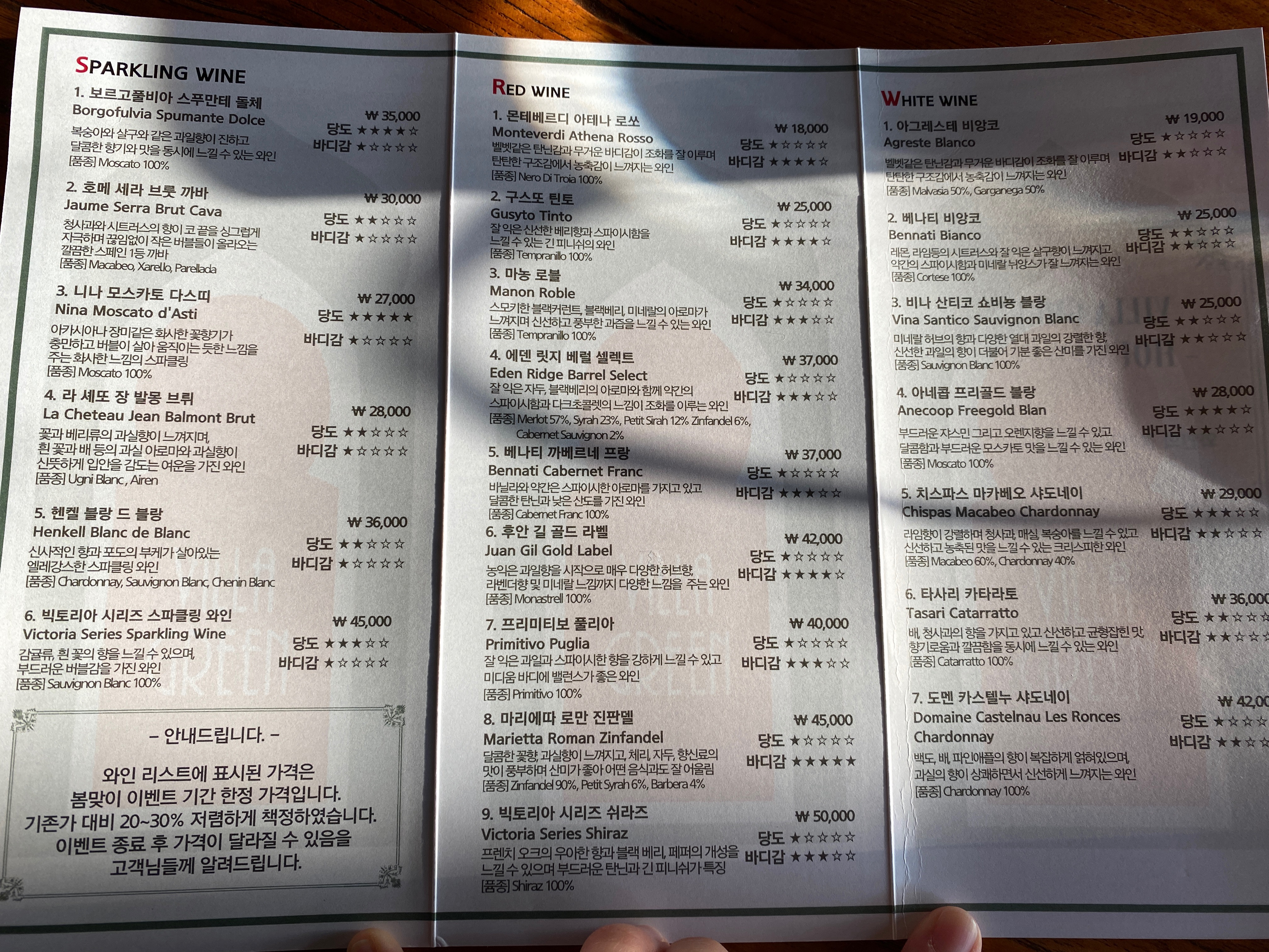 빌라그린 메뉴판이에요🙂